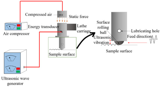 USRP is a novel SPD technique that combines the benefits of UIP and deep rolling (DR) [100]. USRP techniques were developed in 2008 to obtain superior surface properties at a reduced surface roughness [101]. The schematic of the USRP is illustrated in Figure 15. The USRP consists of an ultrasonic wave generator, compressor, and tooltip. The tooltip is associated with a lathe carriage [102]. The tooltip is round, and a static force is applied to the tooltip that performs the rolling operation. The tooltip vibrates at ultrasonic frequency, and static force is applied through compressed air. The repeated impact of the tooltip at such a high frequency, along with the static force, produces both elastic and plastic deformation on the substrate [100]. After the USRP, the elastic deformation recovers, and plastic deformation significantly reduces the surface roughness of the treated specimen. The oil through the lubricating hole in the tooltip reduces the friction between the tooltip and substrate material. In addition, this acts as a coolant, improves the treated surface appearance, and provides superior dimensional tolerance [103].