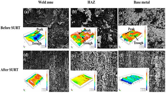 Surface morphology and surface roughness of the untreated (a) weld zone, (b) HAZ, (c) and base material before SURT and (d) weld zone, (e) HAZ, (f) base material after SURT. Reprinted with permission from [110]. Copyright 2020, MDPI.