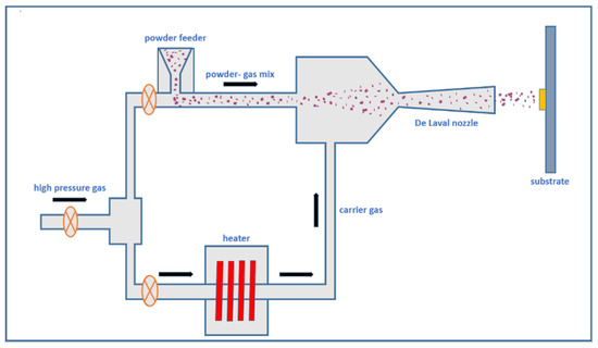 The HPCS is an advanced method of powder particle deposition that is a solid state coating process with minimal heat input [112]. The HPCS can be used to restore dimensions, repair damages, and manufacture near-net shape components [113,114]. The HPCS system is shown in Figure 17. During HPCS, gases such as nitrogen or helium under high pressure (up to 1000 psi) are preheated and propelled through a converging-diverging De-Laval nozzle. When the high-pressure preheated gas flows through the nozzle, it converts enthalpy into kinetic energy, and expansion occurs, accelerating the gas to a supersonic speed. The powder to be coated on the substrate is axially fed into the gas stream before it reaches the nozzle. The powder particle accelerates and impacts the substrate. This occurs at high velocity and pressure, and the kinetic energy of the powder particle is used for deposition rather than the thermal energy [115,116]. Upon impingement on the substrate, the powder forms dense and strong adherent coatings. This process induces a high strain rate during the plastic deformation of powder particles, and involves the adiabatic shear instability to occur at the inter-particle and particle/substrate interfaces [117].