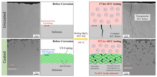 The nature of the deformation and bonding mechanism, such as metallurgical bonding and mechanical interlocking, plays a predominant role in the coating [118,119]. Proper selection of HPCS process parameters is essential to deposit a high-quality coating on the weld joints. Despite the fact that the HPCS is not a straightforward peening technique, the supersonic particle deposition of powder causes a peening effect on the substrate, causing severe plastic deformation on the welded joint [120]. This can enhance DSCs’ corrosion resistance, wear resistance, hardness, surface characteristics, and longevity. The effect of RCS prevents the potential CISCC issues in the nuclear canisters. Recently, Qu et al. [121] conducted HPCS deposition of SS 304L powders on SS 304L joints that underwent GTAW and demonstrated enhanced CISCC resistance of coated substrate in boiling MgCl2. The coated specimen tested for up to 552 h showed no signs of CISCC in the substrate. However, the uncoated substrate failed at approximately 17 h. The authors suggested that peening effects during HPCS deposition induced RCS that enhanced the CISCC resistance of the weld joints. The proposed CISCC mechanism is shown in Figure 18. The authors performed a four-point bend test and immersed the specimen in boiling MgCl2. The SEM of the uncoated and coated substrate before SCC testing is shown in Figure 19 (left side). After the immersion in boiling MgCl2, the uncoated substrate failed by transgranular CISCC.