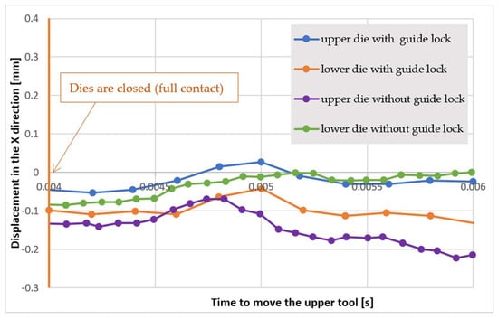 - The measurements of the displacement of the forging tools with respect to each other, together with the measurements, confirmed that, at the height of the locks (i.e., 5 mm), the displacement in the X-axis is stable and does not exceed 0.05 mm, despite the clearance in the locks resulting from the developed geometry, which is 0.06 mm. The use of guiding locks positively affects the displacement value and the quality of the produced forgings.