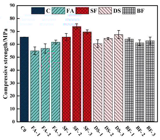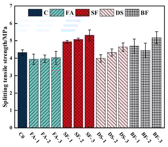 Figure 2 displays the test results of several admixtures on the 28 d splitting tensile strength of concrete. The incorporation of FA results in a reduction in the splitting tensile strength of concrete. As the amount of FA admixture increases, there is only a slight improvement in the splitting tensile strength. This can be attributed to the lower reactant activity of FA, which hinders the formation of hydration products [45] and consequently reduces the splitting tensile strength of concrete.