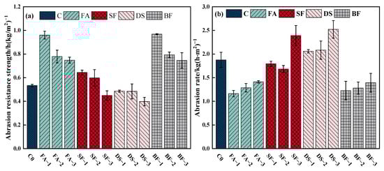 To summarize, the addition of FA and BF to concrete can enhance its abrasion resistance. Both admixtures exhibit the highest abrasion resistance strength and the lowest abrasion rate when used in small amounts. However, it is important to note the mechanisms by which these admixtures differ from each other. The addition of FA diminished the cement hydration heat and mitigated cracks caused by concrete shrinkage [50], hence enhancing its abrasion resistance. BF evenly distributes randomly within the concrete, forming a distinct three-dimensional network structure. This structure effectively prevents the creation and diffusion of cracks during the early stages of cement shrinkage and hardening [51]. It also reduces the detachment of fragments from the concrete matrix, thereby minimizing damage caused by abrasion.