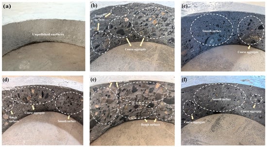 Figure 4 displays the surface of the inner ring of concrete both before and after the abrasion resistance test. Figure 4a,b illustrates the surface of the inner ring prior to and subsequent to the abrasion of OC, respectively. The concrete surface was smooth and devoid of abrasions prior to abrasion. Figure 4c–f illustrates the inner wall morphology of the concrete following the execution of abrasion resistance tests on the concrete containing FA, SF, DS, and BF. The results indicate that the FA-1 group (with a 10% FA dosage), and the BF-1 group (with a 0.05% BF dosage) show minimal abrasion on the surface layer of the concrete. The inner ring surface remains smooth, with only a small portion of the coarse aggregate exposed.