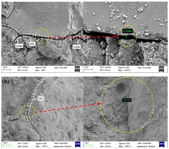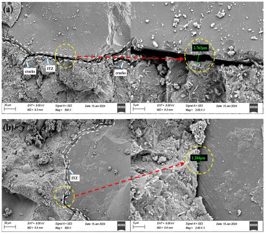 Figure 8a,b illustrate the microscopic morphology of the concrete from group C0 and group DSC-1, respectively. The concrete of the DSC-1 group has a dense structure with a narrow ITZ of 201.0 nm, in contrast to the C0 group. The microscopic features of the DSC-1 group indicate its superior abrasion resistance, with these microscopic phenomena aligning with the macroscopic results of abrasion resistance strength.