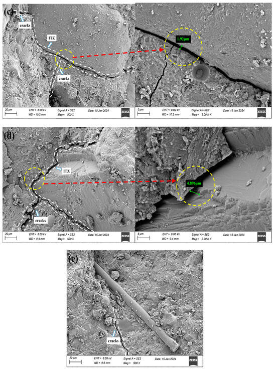 The microscopic morphology of the concrete with the single optimal admixture was observed using SEM, and the representative results are presented in Figure 5. Figure 5a–c reveals that the OC specimens exhibit a broader interfacial transition zone (ITZ) measuring 2.763 μm alongside a limited number of microcracks and a looser structure. The inclusion of FA and SF markedly enhanced the interface bonding between aggregate and paste, resulting in ITZ widths lower than the 2.763 μm observed in OC, with fracture widths likewise finer than those. Figure 5b,c illustrates that the ITZ widths of concrete incorporating FA and SF are 1.284 μm and 1.92 μm, respectively. The ITZ of concrete with FA is narrower than that of concrete with SF. This microscopic interfacial structure partially reflects the outcomes of macroscopic testing, as a smaller ITZ width contributes to the paste’s resistance to scouring by water flow, thereby enhancing the concrete’s abrasion resistance strength. FA improves the abrasion resistance of concrete to a greater extent than SF. Comparing Figure 5a,d, it is observed that the ITZ width of DSC measures 4.896 μm, exceeding that of OC, and a looser structure and poor integrity in DSC. The soft and smooth surface of the DS may negatively influence the ITZ properties, leading to diminished abrasion resistance. Figure 5e illustrates that the introduction of BF into the concrete results in a random distribution of the fibers, lacking a defined arrangement, while the fiber surfaces are coated with numerous hydration products that enhance the adhesion of the fibers to the concrete matrix. The crack resistance role of the fibers restraining crack formation in the concrete leads to a denser structure of the fiber-reinforced concrete and enhanced abrasion resistance.
