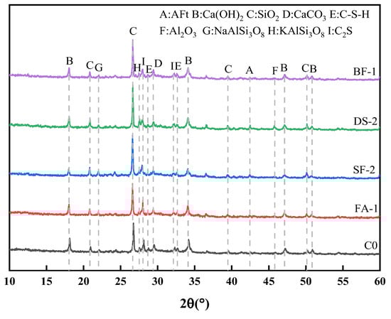 Figure 6 illustrates the XRD patterns of the hydration products produced from concrete using various admixtures. The incorporation of admixtures did not alter the primary crystalline phases of the hydration products, which predominantly included ettringite (AFt), Ca(OH)2, SiO2, calcium carbonate (CaCO3), C-S-H, and a minor presence of dicalcium silicate (C2S). Notably, C2S is the principal mineral in the cement [52], indicating that unhydrated cement clinker minerals remained in the concrete after 28 days of curing.