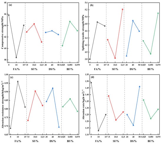 Figure 7d reveals that the concrete abrasion rate initially decreases and increases afterward when the contents of FA, SF, DS, and BF increase. The minimum abrasion rate occurs at an FA content of 10%, SF content of 10%, DSRR of 40%, and BF content of 0.05%. This corresponds to the trend of concrete’s abrasion resistance strength.