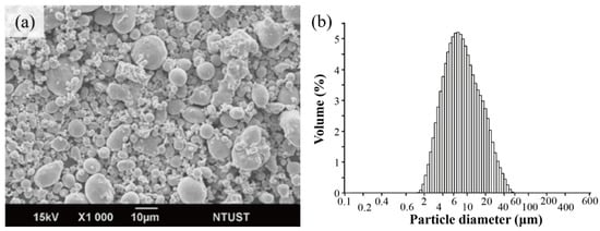 The metallic material used in this study is water-atomized 17-4 PH martensitic precipitation-hardened stainless steel procured from Tiz-Advanced Alloy Technology CO., Ltd. China, Quanzhou City, Fujian Province. Figure 1a shows the powder morphology and particle size distribution of the selected material. The shape of the powder shown in the figure is non-spherical, with a rounded surface morphology and slight agglomeration (distributed by Jiahui Optoelectronics). Its chemical composition meets the Metal Powder Industries Federation (MPIF 35) standard. The particle size distribution of the original 17-4PH powder was confirmed using a Beckman Coulter LS230 laser particle size analyzer (Brea, CA, USA), with a D50 of 8.23 μm (Figure 1b).