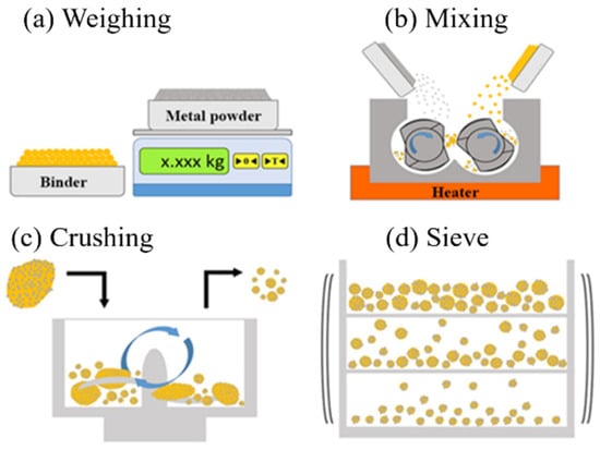 Figure 2 shows the schematic representation process used in this study to produce composite powders, which includes heating the metal powder and binder material, and mixing them under pressure using a rotor. When the binder is in a molten state, the metal powder is uniformly dispersed and mixed with the binder to form a hybrid composite material. After cooling, the material is crushed and sieved to obtain a composite powder. Figure 3 shows the manufacturing process of mixing metal powder and polymer binder using a mixer, which is divided into six stages. In the first stage, the metal powder is placed in a mixing chamber and heated to 160 °C to remove moisture from the powder, as shown in Figure 3a. In the second stage, after adding binders (POM, HDPE, and SA), it is heated to 170 °C as shown in Figure 3. In the third stage, the adhesive is completely melted and forms a dough shape. At this point, the metal powder and adhesive are fully mixed as shown in Figure 3c. In the fourth stage, the heater is turned off to start cooling the composite material, and it can be observed that the composite material begins to harden and form blocks as shown in Figure 3d. In the fifth stage, the temperature of the composite material continues to decrease until it becomes gravel-like as shown in Figure 3e. After powdering the gravel-like composite material particles, the LS-300T (Lao Song Machinery Co., Ltd., New Taipei, Taiwan) vibrating screen was used for screening as shown in Figure 3f. The vibrating screen has 120, 140, 170, 200, 230, 270, and 325 mesh screens, and the particle size distribution range of the screens is used to investigate the effect on printing parameters.