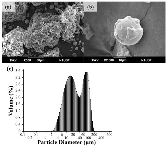 The SEM image in Figure 4 shows (a) the morphology of the composite powder core–shell, (b) the structure of the composite powder core–shell, and (c) the particle size analysis of the composite powder. The adhesive with a low melting point is mechanically stirred and heated together with 17-4PH powder. During the process, the adhesive melts and becomes viscous. With the adsorption effect of the material capillary phenomenon, 17-4PH powder is bonded into clusters. Figure 4a shows the composite powder that has been bonded into clusters and powdered, with obvious clustering observed. Figure 4b shows the scattered composite powder, with the core 17-4PH powder particles and the surrounding binder, exhibiting a typical core–shell structure. Figure 4c shows the PSD calculation results of the composite powder after sieving, with a D50 of 24.81 μm.