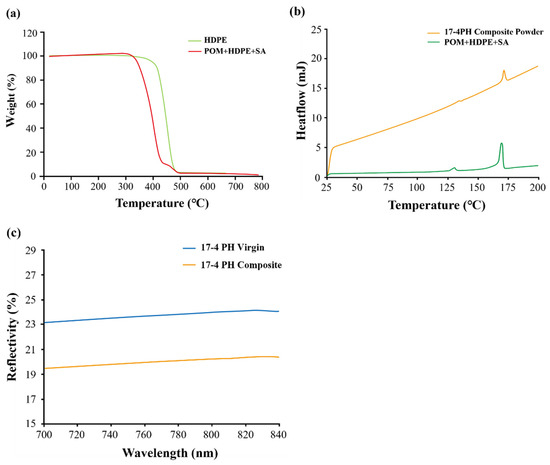 Figure 5b shows DSC analysis, expressing the changes in the adhesive during heating. DSC detection reveals the thermal changes in the material during the heating process. According to the TGA test results in Figure 5a, it is known that the adhesive begins to lose weight at 285 °C, and the heating temperature for DSC testing should be below 285 °C. Heating of the material at a rate of 10 °C/min is analyzed. The DSC results indicate that the composite powder exhibits two melting peaks. The first melting peak appears between 123 °C and 136 °C, corresponding to HDPE, while the second melting peak appears between 159 °C and 175 °C, corresponding to POM. This message indicates that the maximum temperature for producing composite materials of 17-4PH powder and binder should be between 159 °C and 175 °C. At the same time, we also learned about the preheating temperature range during the printing process. Two key data points were obtained through DSC: the manufacturing material and the preheating temperature for printing.