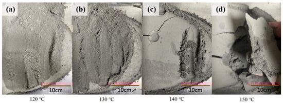17-4 PH composite powder preheated at four different temperatures (a) 120 °C, (b) 130 °C, (c) 140 °C and (d) 150 °C (from left to right).