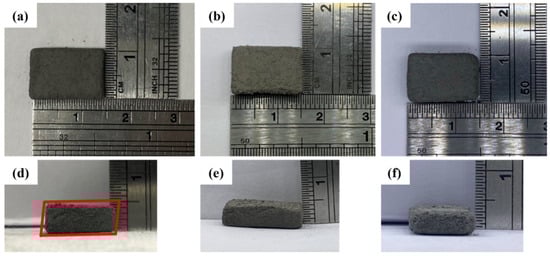 Figure 7 shows the effect of layer thickness on the green body. The forming state of the green body is closely related to the layer thickness, mainly depending on the forming energy. When the energy cannot form a fixed thickness, the object will remain in powder or sheet form. This study observes the effect of different thicknesses on forming to ensure shape integrity before continuing the degreasing process. Figure 7a,d show a parallelogram shape on the side with a thickness of 75 μm. Figure 7b,e show the minimum deformation at a thickness of 100 μm. Figure 7c,f show that the thickness is 125 μm, and the corners are rounded and loose. The printing thickness is set to 100 μm.