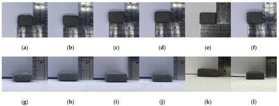 Figure 8a–l show the density and size of green bodies printed using different laser energy densities at preheating temperatures of 130 °C and 140 °C (Table 2). It can be observed that changes in laser energy density affect the growth of green bodies, transitioning from loose structures to stable forms, with corners gradually becoming sharper. At a preheating temperature of 140 °C, all three laser energy densities can produce high-intensity green bodies. The shape is complete and exhibits the highest green density, but excessive energy not only causes deformation but also melts and binds the surrounding powder to the object, resulting in a larger green body size and heavier weight. In this experiment, with a preheating temperature of 140 °C and a laser energy density of 35.87 mJ/mm2, the maximum green body density achieved was 3.61 g/cm3, and there was an increase of 20.33% compared to the minimum green body density of 3.00 g/cm3. Therefore, the subsequent degreasing and sintering experiments will use a layer thickness of 100 μm, a preheating temperature of 140 °C, and a laser energy density of 35.87 mJ/mm2 to print the samples.