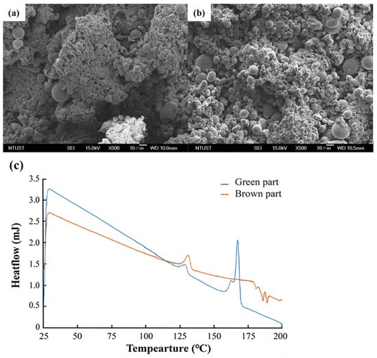 Figure 9c shows the DSC test results of the printed green body and degreased brown body against HDPE and POM in the adhesive. HDPE and POM have different melting peaks. Based on the principle of degreasing, the degreasing temperature is only 140 °C, much lower than the decomposition temperature of HDPE at 330 °C. The degreasing process only removes POM material. DSC can be used to test the melting point and phase transition temperature of materials, as well as to identify different types of materials. To confirm the degreasing process, this study used DSC to detect the endothermic state of green and brown bodies during heating and compared their respective DSC curves. However, the DSC curve of the brown body only showed a clear HDPE melting peak, and compared with the DSC curve of the green body, there was no obvious curve between 140 °C and 175 °C, indicating that only POM material was basically removed, while HDPE was not significantly removed. Figure 9a shows the bonding phenomenon of composite materials after laser sintering. Figure 9b shows the phenomenon of POM reduction after green body degreasing. It was observed that the green body exposed some particles of 17-4PH powder due to POM reduction and also bonded into clusters. According to the DSC test results in Figure 9c, HDPE was the main component of bonding.