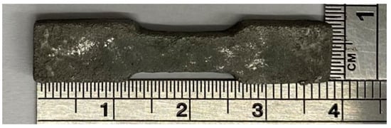 Table 3 shows the mechanical strength of the sintered brown body. According to TGA test results, HDPE begins to experience weight loss at 330 °C, with no significant weight change around 500 °C, and significant weight loss between 412 °C and 475 °C. Therefore, the thermal desorption stage of sintering is set to stay at 350 °C and 450 °C for 120 min, respectively. Nitrogen gas is introduced throughout the thermal desorption stage at a flow rate of 25 L/min. The highest temperature is set at 1310 °C for 180 min, and the total sintering time is 22 h. The final dog bone sample obtained is shown in Figure 10. It was found that the average shrinkage rate after sintering is 22%, the density is 7.57 g/cm3, reaching a theoretical density of 97%, the hardness is HRC 14.8, reaching 57% of the theoretical value, and the tensile strength is 605.64 MPa, reaching 65% of the theoretical value.