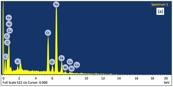 It is known that the chemical formula of POM (polyoxymethylene) is (CH2O)n, the chemical formula of HDPE (high-density polyethylene) is (C2H4)n, and the chemical formula of SA (stearic acid) is C18H36O2. Therefore, EDS was used to observe the changes in carbon and oxygen elements to confirm the state of the reduced binder, as shown in Table 4. From the degreasing stage, the binder was lost, and after sintering, it was almost removed.