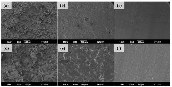 Figure 12 shows the front of the sample, including after printing, sintering, and grinding after sintering. Printing was carried out using the optimal parameters of a layer thickness of 100 μm, a preheating temperature of 140 °C, and a laser energy density of 52.46 mJ/mm2. The degreasing parameters were as follows: anhydrous oxalic acid consumption of 5 g/min, nitrogen consumption of 50 L/min, degreasing temperature of 140 °C, and degreasing time of 5 h. Finally, the brown body was metalized by high-temperature sintering. Figure 12a,d show the characteristics of the adhesive bonding into clusters in composite materials due to laser sintering. There are many metal powders in the material, making the shape of the sintered neck complex and not obvious. Figure 12b,e show the surface after sintering, in a no powder state, with a good sintering state of metal powder, and visible large pores. Figure 12c,f show the surface after grinding. To confirm whether only the surface has large pores after sintering, removing the rough layer on the surface showed that there were no large pores after grinding, only some small pores.