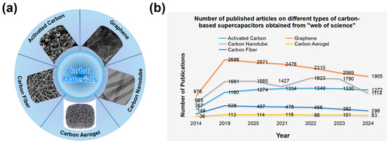 (a) Carbon-based materials for supercapacitors. (b) Trends in research publications on different carbon-based supercapacitors (2014–2024).