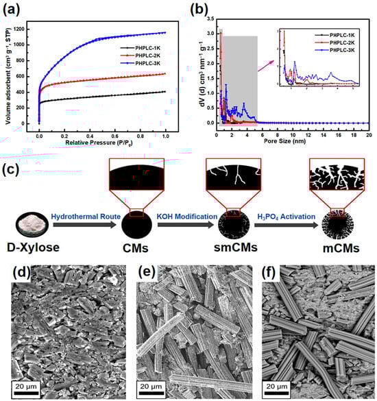 (a) The nitrogen adsorption–desorption curves and (b) the distribution of pore sizes within the phosphoric acid plus hydrogen peroxide (PHP) lignin-derived carbons (PHPLCs) [71]. (c) Schematic diagram of the pore formation mechanism on the carbon surface through sequential KOH-H3PO4 activation [74]. SEM micrographs of the electrode produced from the ACs activated with (d) CO2, (e) H2O and (f) KOH [75].