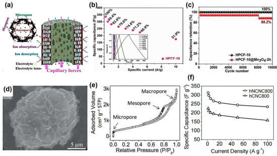 (a) EDLC mechanism of self-standing HPCF-10 electrode. (b) Rate performance curves of HPCF-10 electrode from 0.2 A g−1 to 10 A g−1, (c) cycling stability of HPCF-10 at the current density of 10 A g−1 [96]. (d) SEM image, (e) nitrogen adsorption and desorption isotherm and (f) gravimetric capacitances at different charge–discharge current densities of hNCNC800 [97].