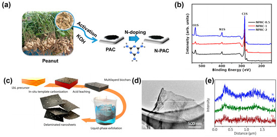 - Tian, W.; Gao, Q.; VahidMohammadi, A.; Dang, J.; Li, Z.; Liang, X.; Hamedi, M.M.; Zhang, L. Liquid-phase exfoliation of layered biochars into multifunctional heteroatom (Fe, N, S) co-doped graphene-like carbon nanosheets. Chem. Eng. J. 2021, 420, 127601. [Google Scholar] [CrossRef]