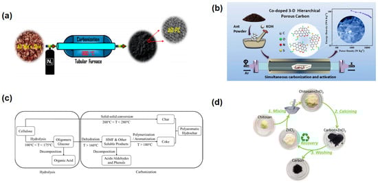 Chemical activation is a widely adopted method for fabricating porous carbon materials, valued for its ability to tailor the pore structure and significantly enhance specific surface areas [64,65]. Compared with physical activation, chemical activation presents numerous benefits: it achieves higher carbon yields, operates at comparatively lower temperatures, and results in porous carbon with elevated mesopore ratios. This technique involves impregnating a carbon precursor with chemical activating agents, followed by carbonization at elevated temperatures, typically between 400 °C to 800 °C. Basic chemicals, such as KOH, KHCO3, NaHCO3, K2CO3, and ZnCl2 as well as acids, such as H3PO4, H2SO4, and HCl, are typical chemical agents utilized in the chemical activation process of carbon [66,67,68]. The choice of chemical and its concentration play a crucial role in determining the nature and distribution of the pores developed. Understanding the specific effects of these agents on the activation process is essential for tailoring porous carbons with desired properties for various applications.