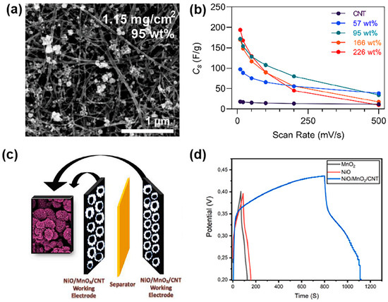 - Peçenek, H.; Dokan, F.K.; Onses, M.S.; Yılmaz, E.; Sahmetlioglu, E. Outstanding supercapacitor performance with intertwined flower-like NiO/MnO2/CNT electrodes. Mater. Res. Bull. 2022, 149, 111745. [Google Scholar] [CrossRef]