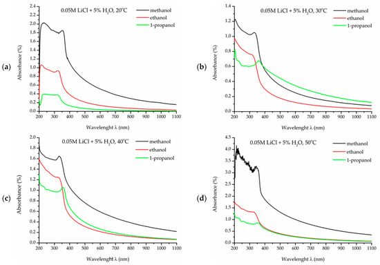 The measurement of particle size in colloidal solutions was carried out for samples obtained in methanol, ethanol, and 1-propanol solutions with a lithium chloride concentration of 0.05 mol/dm3 (0.05 M LiCl), with the addition of 5% water by volume. An additional parameter that differentiated the samples was the temperature at which the synthesis process was conducted. The temperature range used was 20, 30, 40, and 50 °C from ambient temperature to the value below the boiling point of methanol, the first alcohol in the series.