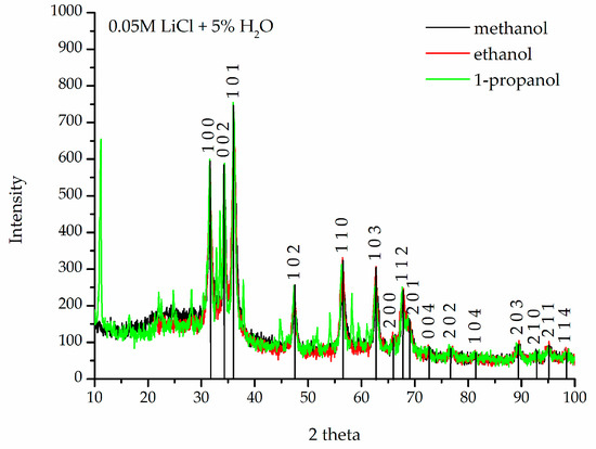 Figure 2 shows the results of XRD analysis of the nanopowders obtained in 0.05 M LiCl solution with 5% vol. water. The spectra show peaks characteristic of crystalline zinc oxide, recorded at corresponding values of angle 2 theta. Each peak corresponds to a plane of the ZnO crystal lattice identified by Miller’s plane indices. The fit is consistent with the pattern for ZnO [38].