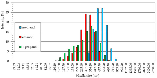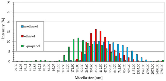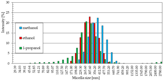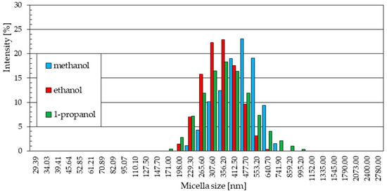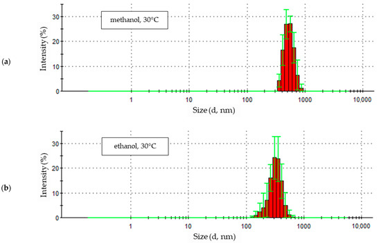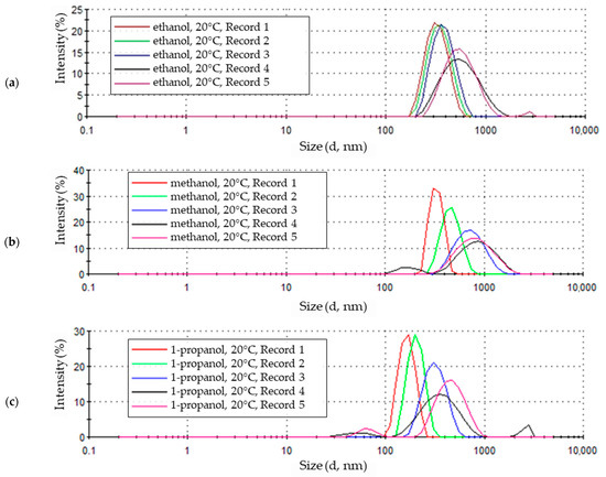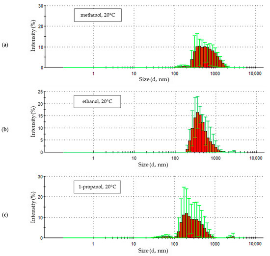 The particle size distributions from methanol (Figure 5a) and 1-propanol (Figure 5c) solutions are similar. In both cases, a small fraction of particles of small diameter was observed (229.3 nm and 265.6 nm for methanol and 127.5 nm and 147.7 nm for 1-propanol). These distributions are dominated by signals of similar intensity, indicating the presence in the samples of similar numbers of particles of increasingly larger sizes, the quantitative share of which decreases gently as they reach their maximum sizes.