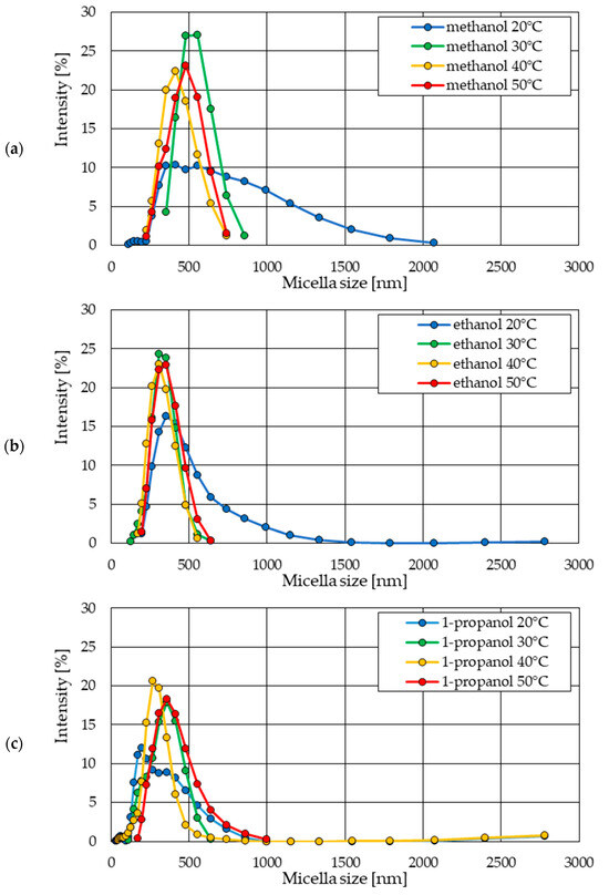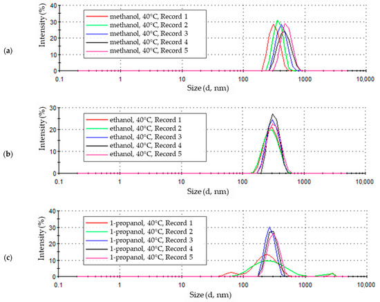 The statistical size distribution of particles formed in a 1-propanol solution with the addition of 5% water by volume at a temperature of 40 °C is shown in Figure 9c. The maximum intensity of 20.6% was achieved by the particle fraction of 265.2 nm. The particles in the sample were largely homogeneous. The four most abundant fractions in the sample made up almost 70% of the total particles in the sample and ranged in particle size from 229.3 nm to 356.2 nm. The share of smaller particles in the sample with 1-propanol solvent includes eleven fractions of particles with sizes between 45.64 nm and 198.0 nm. Except for three of them, with intensity values of 2.7%, 3.6%, and 7.6%, the rest did not exceed intensity values above 2%. The presence of particles larger than the most abundant ones in the sample is shaped similarly. In the size range above 356.2 nm up to 2780 nm, 11 particle fractions were also determined but did not reach intensity values above 1%.