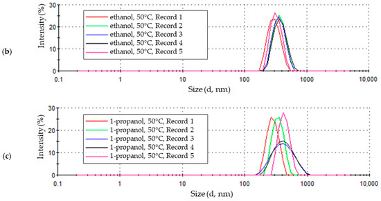 The sample obtained in a solution with a 1-propanol solvent at a temperature of 50 °C (similar to the process temperature of 30 °C) contained the largest number of particles with a size of 356.6 nm, for which the measurement intensity was 18.3% (Figure 11c). The next two results with the highest intensity were for particles of 307.6 nm and 412.5 nm, and their values were 16.5% and 16.4%, respectively. The three most numerous fractions in the sample constituted more than half (51.2%) of the number of particles identified in the tested solution. The remaining part consisted almost equally of particles of smaller and larger sizes. Smaller particles were more homogeneous and were divided into four fractions whose quantitative share of particles was 22.3%, while among the larger particles, there are six fractions, the sum of which is equal to 26.6% of the total number of particles.