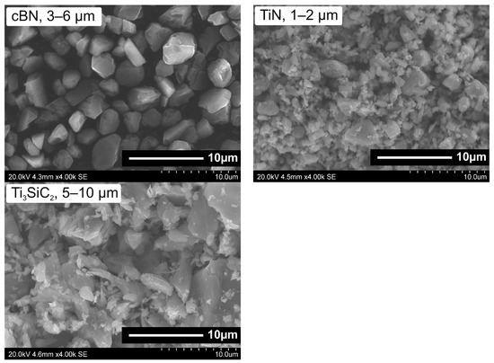 Cubic boron nitride (3–6 µm, Micron+ ABN M36, Element Six, Shannon, Ireland), titanium nitride (1–2 µm, C-grade, HC Starck, Goslar, Germany) and titanium silicon carbide (5–10 µm, Maxthal 312, KANTHAL, Hallstahammar, Sweden) powders were used as starting materials for preparing mixtures in the following proportion: 65% vol. cBN/20% vol. TiN/15% vol. Ti3SiC2. This composition was abbreviated as BNT after the names of the main components. Due to the fact that Ti3SiC2 powders rarely occur in pure, single-phase form, an XRD analysis was performed which showed that Maxthal 312 contains about 10 mass % of TiC. Figure 1 shows the morphology (SEM) of the powders selected for the composite mixture.