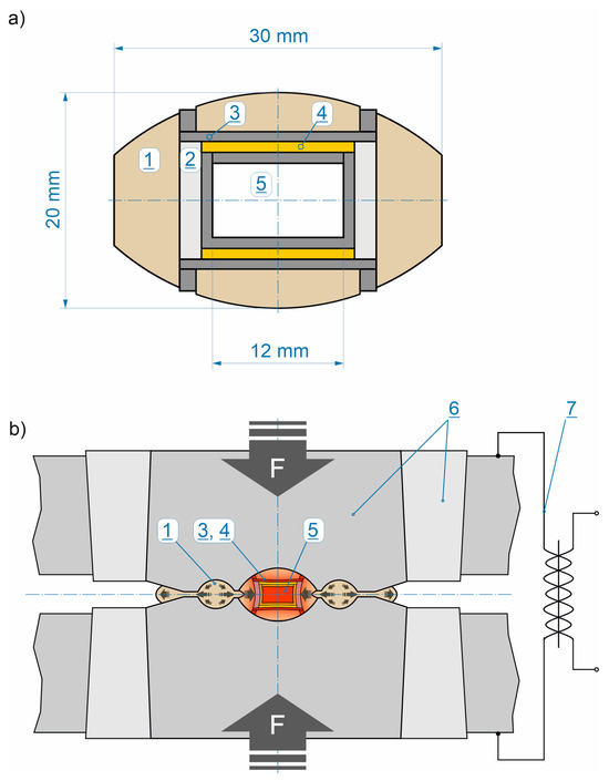 Sintering of materials in the HPHT toroidal apparatus: (a) Sample assembly: 1—mineral gasket, 2—hBN insulator, 3—graphite heating elements, 4—graphite + ZrO2 resistors (additional heating elements), 5—sample (compacted powder); (b) Operational diagram of the toroidal apparatus: quasi-isostatic compression of the preliminary consolidated powders (5) is achieved as a result of plastic deformation of the mineral gasket (1) between anvils (6); electrical heating of the sample is provided by a high-power current transformer (7) and heating elements (3, 4).