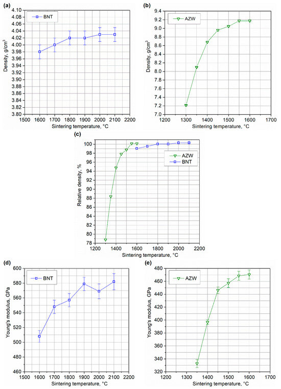 Density (a,b), relative density (c) and Young’s modulus (d,e) of BNT and AZW composites sintered with HPHT and SPS methods, respectively.