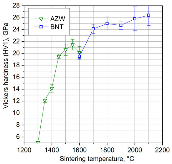 In contrast, the BNT composite sintered at 1600 °C exhibited a hardness of about 19.5 GPa, which then jumped to 24 GPa at 1700 °C. At higher temperatures, the hardness of the BNT composite increased more gradually.