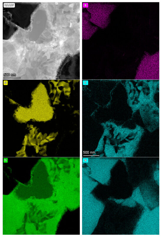 For the composite sintered at 1900 °C, it was observed that boron, other than appearing within the cBN grains, formed fine needle-like structures within the bonding phase. Carbon, as in the previous sample, was detected around the silicon. Titanium was identified throughout the bonding phase, while nitrogen was not uniformly present in the bonding phase, its intensity dropping almost completely in the areas of silicon and carbon occurrence.