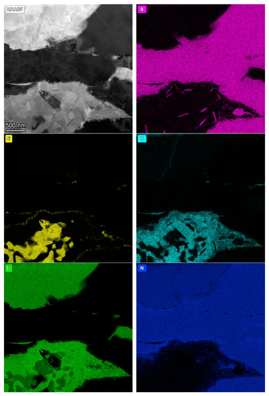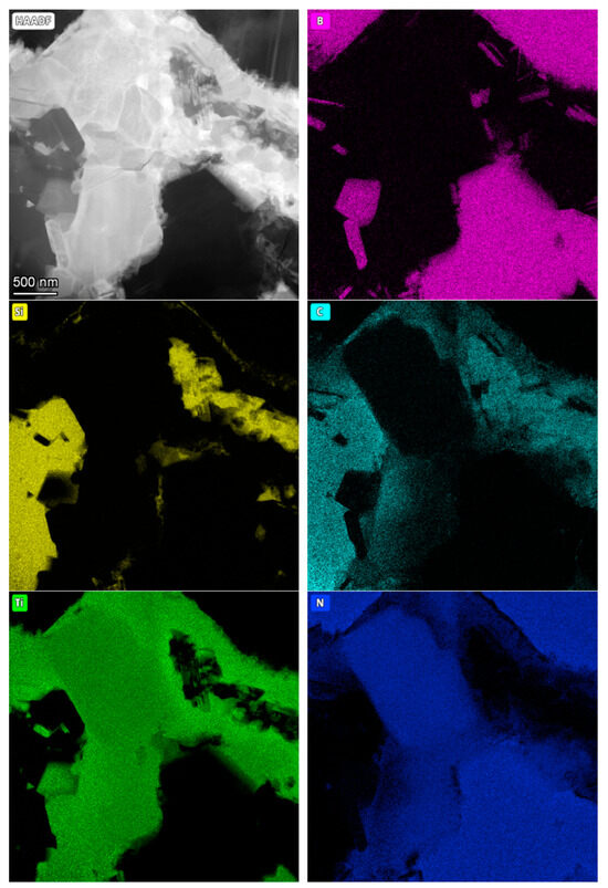 The microstructure observation was performed on three cBN-TiN-Ti3SiC2 composite samples sintered by HPHT at temperatures: 1700, 1900 and 2000 °C, using Transmission Electron Microscope Tecnai G2 F20 (FEI Company, Hillsboro, OR, USA) (2000 kV) equipped with HAADF detector intended for scanning-transmission technique (STEM). Each sample was subjected to a preliminary analysis of the microstructure and then the chemical composition of the samples in the micro-areas was analysed and presented in elemental distribution maps.