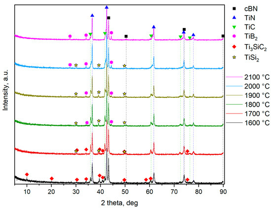 X-ray diffraction confirmed the evolution of the phase composition of the BNT composite with increasing sintering temperature. At 1600 °C, only the phases present in the initial powder mixture were observed: cBN, TiN, Ti3SiC2 and TiC. Among these, cBN, TiN and TiC were consistently present in the composite throughout the entire temperature range considered (Figure 10, dashed lines). The proportion of TiN to TiC changed slightly with temperature, which could be attributed to the formation of the Ti(C, N) solid solution. As the temperature raised to 1700 °C, the intensity of the Ti3SiC2 reflections drastically decreased and peaks characteristic of the intermetallic phase TiSi2 appeared. At 1800 °C, Ti3SiC2 completely disappeared, and a new phase TiB2 emerged. The intensity of the TiSi2 reflections were highest at 1800 °C but decreased with increasing temperature and ultimately vanished at 2100 °C. In the temperature range of 1800 to 2000 °C, the phases cBN, TiN, TiC, TiSi2, and TiB2 coexisted in varying proportions. As the temperature increased from 1800 to 2100 °C, the intensity of TiB2 peaks increased.
