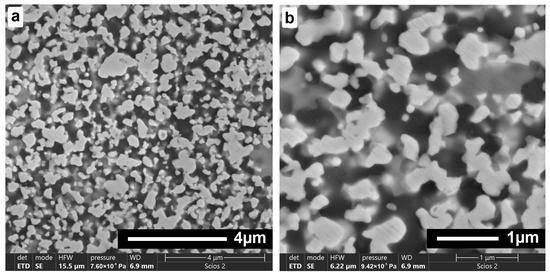 SEM images (Figure 6) revealed a microstructure consisting of multi-walled cBN grains with sharp edges (dark areas) and a uniformly distributed bonding phase, which can be seen as bright areas. Microstructure observations taken at low magnifications indicate a homogeneous distribution of microstructure components regardless of sintering temperature. Neither the growth nor excessive agglomeration of the individual composite components was observed. The sinters exhibit a bi-modal structure, with large crystallites separated by fine crystalline material. With increasing sintering temperature, diffusion of the components within the bonding phase was observed, resulting in the appearance and growth of a heterogeneous structure initially similar to eutectics, which is particularly evident in higher magnification pictures. As the sintering temperature increased, the diffusion of components was noticeably more intense.