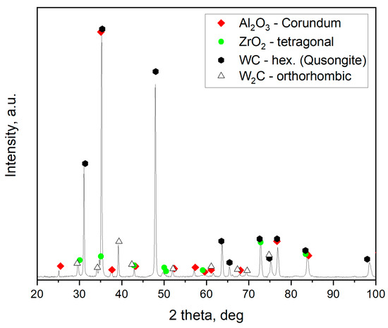 Figure 13 shows an XRD analysis of the AZW composite sintered at 1550 °C. Three initial phases were identified in this sample: Al2O3, ZrO2, and WC. Additionally, tungsten carbide with W2C stoichiometry was present in the composite. It should be noted that a small amount of W2C was included in the starting powder used to prepare the AZW mixture. A certain amount of W2C could also arise as a result of the reduction of WC during the SPS process. In contrast to the BNT material, the phase composition of the AZW composite does not change significantly within the considered sintering temperature range.
