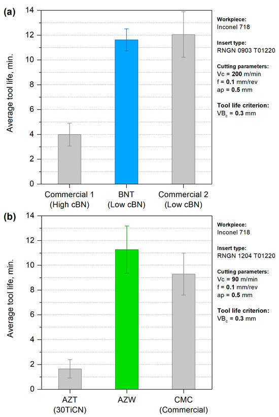 Average tool life of RNGN cutting inserts made from investigated composites when turning Inconel 718 alloy: BNT compared with commercial superhard cBN composites (a), AZW compared with other advanced ceramics (b).