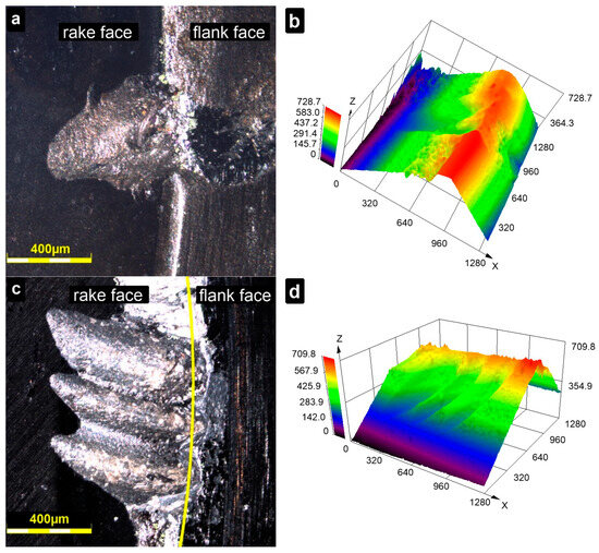 Cutting edges of investigated inserts after turning tests: 2D images (a,c) and 3D topography maps (b,d) of BNT insert (a,b) and AZW insert (c,d); confocal microscope.