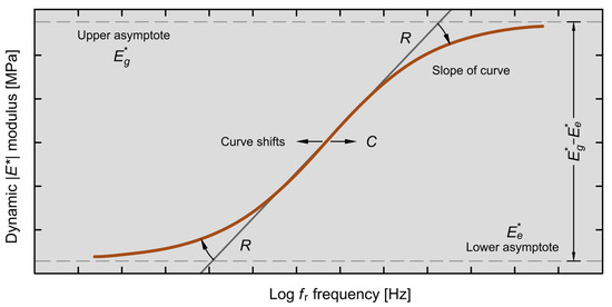 is the asymptote of high frequencies or low temperatures. In Kweon’s study, Equation (3) is named as the modified Ramberg–Osgood model of the asphalt mixture master curve. In the rest of this paper, this model type will be abbreviated as RAMBO.