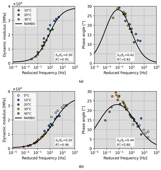 Figure 2b illustrates the scattered correlation between the phase angle and the reduced frequency, highlighting the dominant viscous behaviour of the asphalt mixture. This pattern can be attributed to the limitations of the RAMBO model in capturing the reduced stiffness of asphalt mixtures under conditions where the viscous component prevails, particularly at elevated temperatures and low frequencies.
