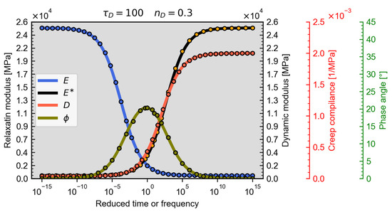 are parameters fitted to experimental values. The unlisted parameters are the same as before. In this research, Equation (8) was used to construct the phase angle master curve.