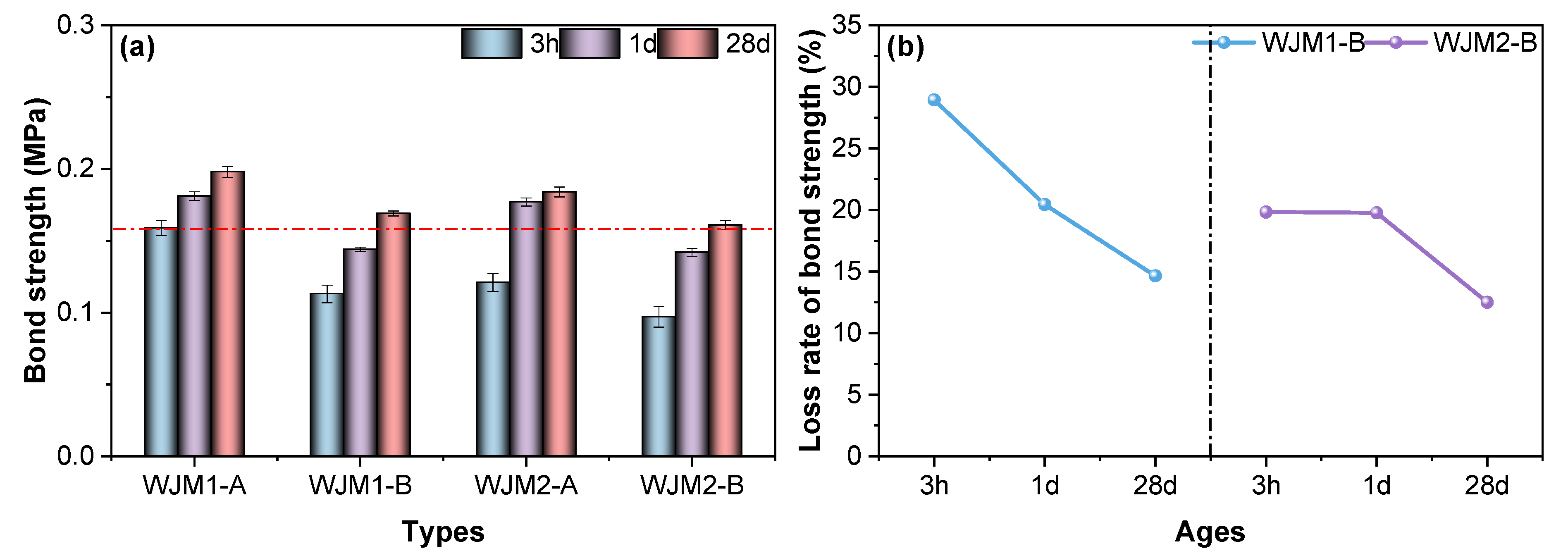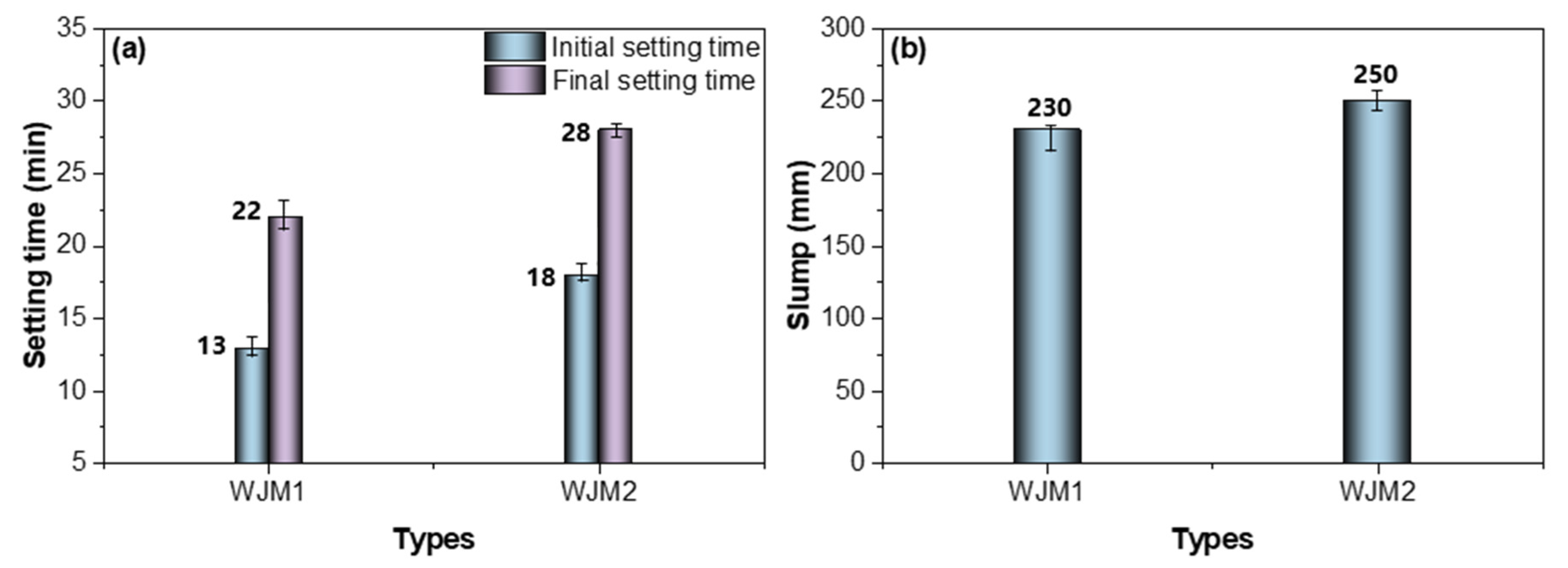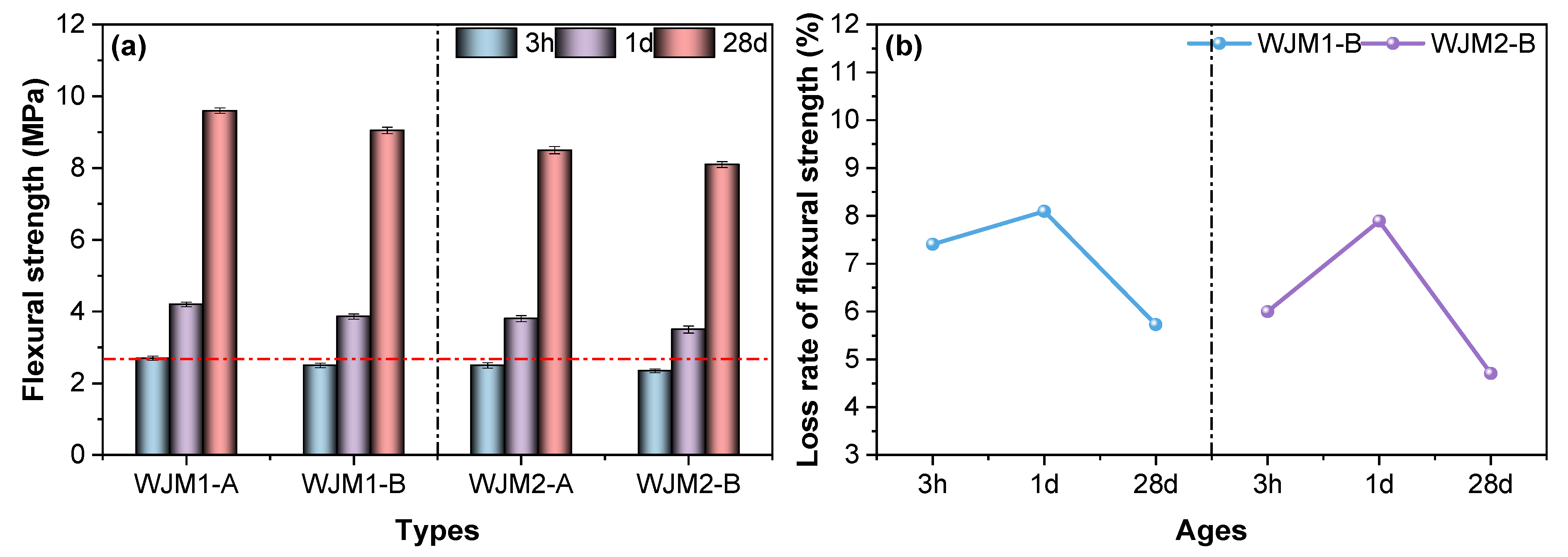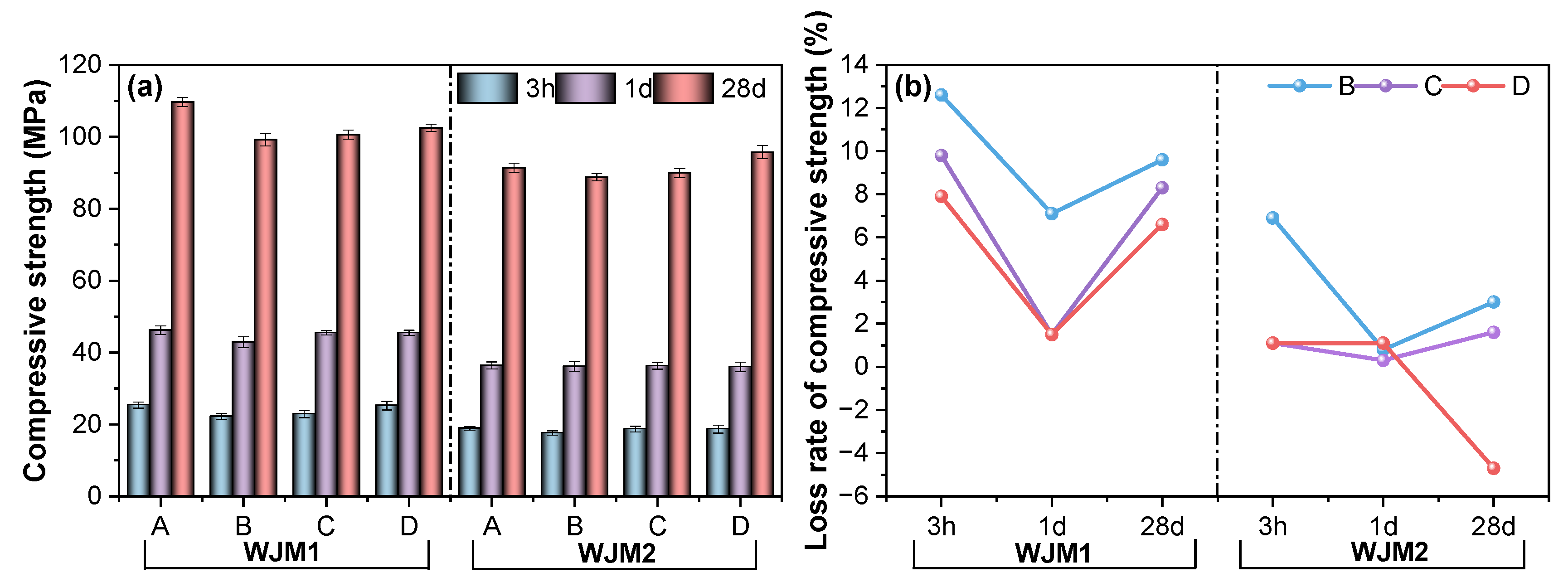 - Comparative evaluation of different mix proportions under various vibration protocols revealed that mixtures with higher water content (WJM2) exhibit relatively better resistance to strength loss. Nevertheless, the detrimental effects of vibration remain evident, suggesting that optimization of both mix design and vibration timing is essential for achieving durable and reliable bridge wet joint connections.