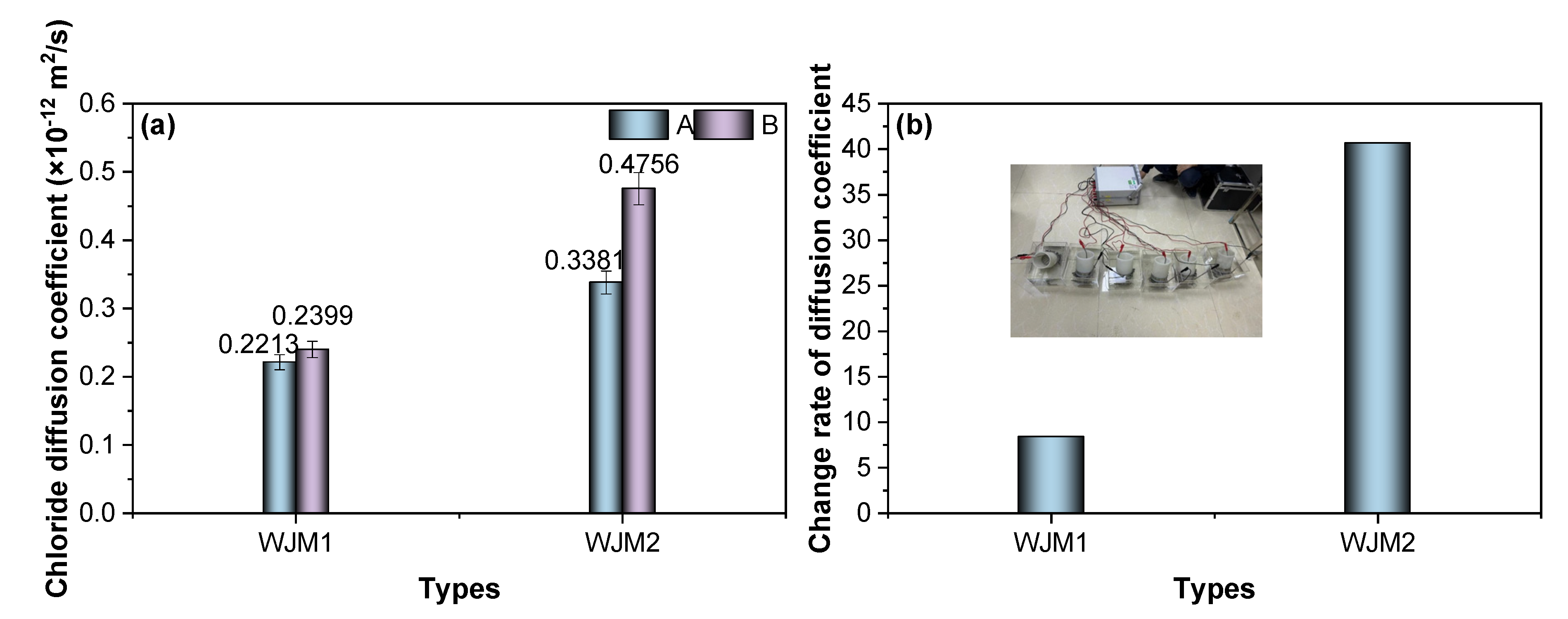 - Chloride penetration tests confirmed that vibration significantly elevates the chloride diffusion coefficient, particularly in mixtures with higher water-to-binder ratios (WJM2). This increased permeability accelerates the risk of chloride ingress and reinforcement corrosion, underscoring the importance of vibration control in durability design.
